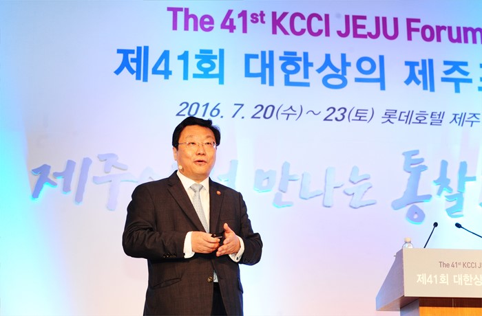 (제주=포커스뉴스) 주형환 산업통상자원부 장관이 21일 제주롯데호텔 크리스탈볼룸에서 열린 제41회 대한상공회의소 제주포럼에 참석해,'수출 활력 회복을 위한 새로운 산업정책 방향'을 주제로 기조강연을 하고 있다. <사진제공=산업통상자원부>