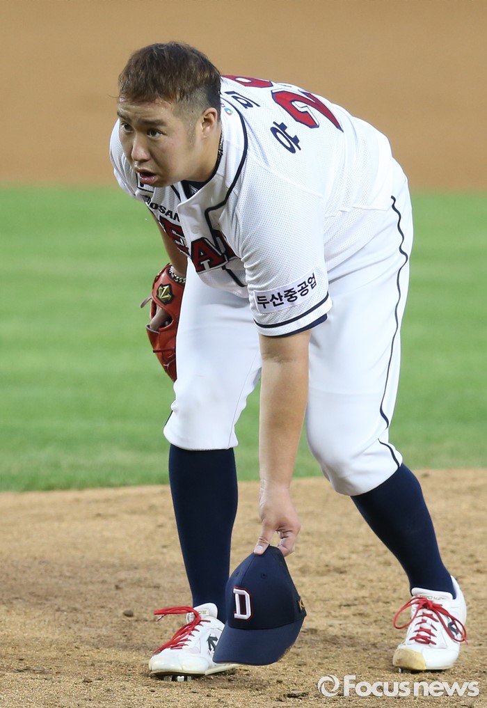 (서울=포커스뉴스) 21일 서울 잠실구장에서 열린 2016 프로야구 삼성-두산 경기 3회초 두산 선발투수 유희관이 투구 도중 벗겨진 모자를 줍고 있다.