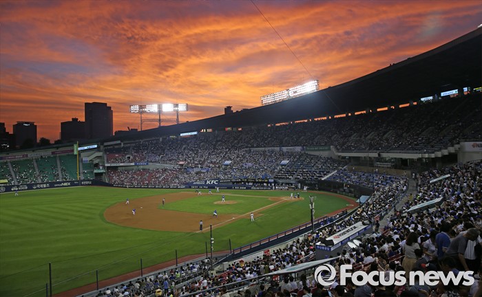 (서울=포커스뉴스) 21일 2016 프로야구 삼성-두산 경기가 열린 서울 잠실구장을 덮은 빨간 노을이 박진감 있는 경기와 더불어 또 하나의 아름다움을 관중들에게 선사하고 있다.