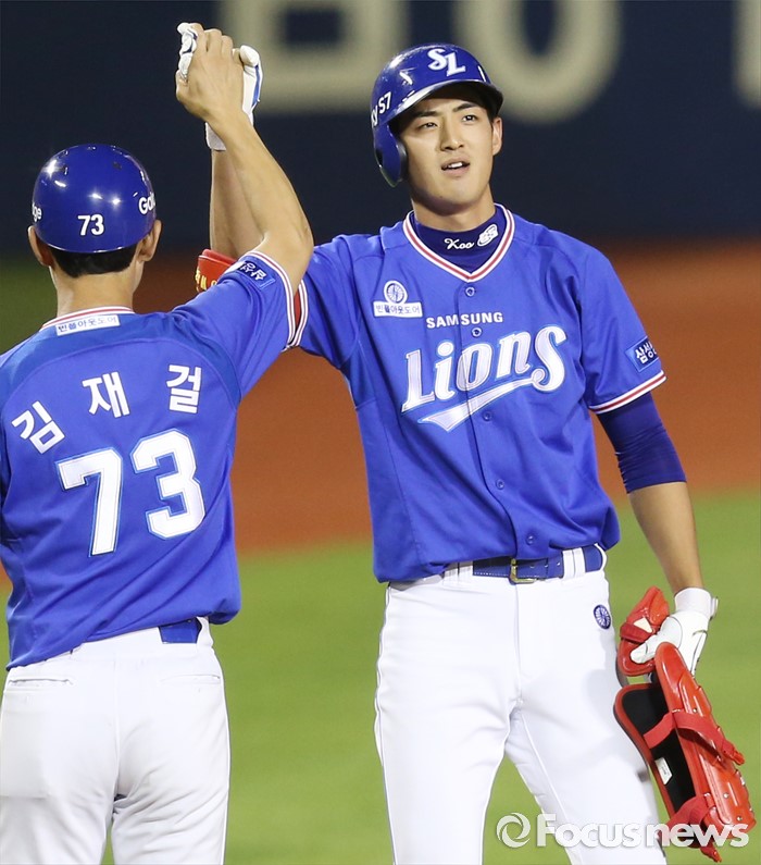 (서울=포커스뉴스) 21일 서울 잠실구장에서 열린 2016 프로야구 삼성-두산 경기 6회초 2사 1,2루에서 삼성 구자욱이 우익선상으로 빠지는 3루타를 쳐 주자를 모두 불러 들이고 3루에서 김재걸 코치와 하이파이브하고 있다.