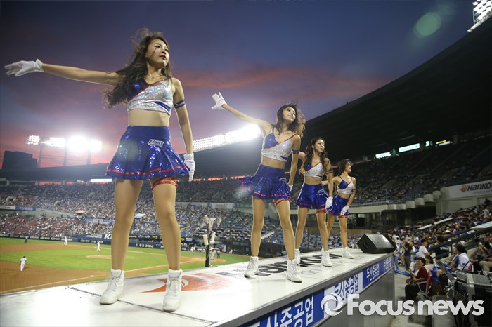 (서울=포커스뉴스) 21일 서울 잠실구장에서 열린 2016 프로야구 삼성-두산 경기에서 삼성 치어리더가 발간 노을이 떨어지는 한 여름밤의 무더위를 날려주는 시원한 춤을 관중들에게 선사하고 있다.