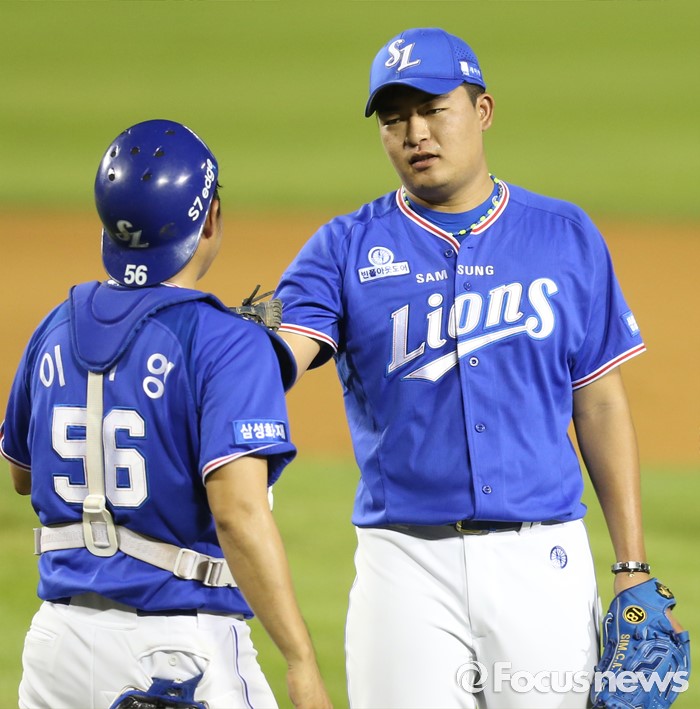 (서울=포커스뉴스) 21일 서울 잠실구장에서 열린 2016 프로야구 삼성-두산 경기에서 이틀 연속 세이브를 따낸 삼성 심창민이 포수 이지영과 승리의 기쁨을 나누고 있다.