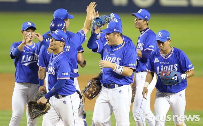 (서울=포커스뉴스) 21일 서울 잠실구장에서 열린 2016 프로야구 삼성-두산 경기에서 두산에 이틀 연속 승리한 삼성 선수들이 마운드에 모여 하이파이브하며 함꼐 기뻐하고 있다.