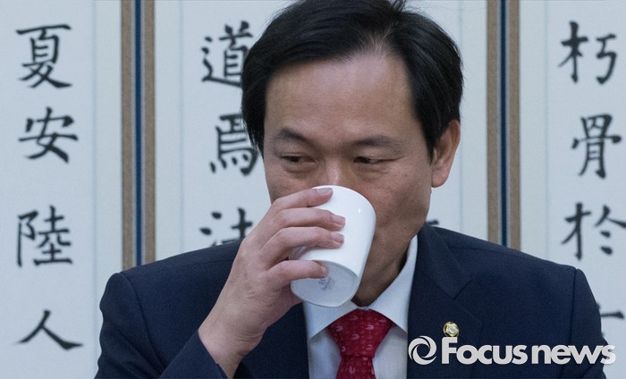 (서울=포커스뉴스) 22일 오전 서울 여의도 국회 귀빈식당에서 열린 한반도 경제·문화포럼 창립총회에 참석한 우상호 더불어민주당 원내대표가 물을 마시고 있다.