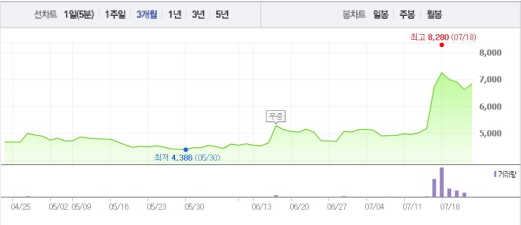다날은 포켓몬 GO의 온라인 결제사 지분 보유 소식에 주목을 받았다. 포켓몬 GO는 미국, 캐나다, 호주 등에 시범 출시된 상태며 현재 앱 매출 순위에서 최상위권에 올라갔다. 한국에서도 포켓몬 GO 열풍이 불고 있다.주가흐름<사진출처=네이버 캡쳐>