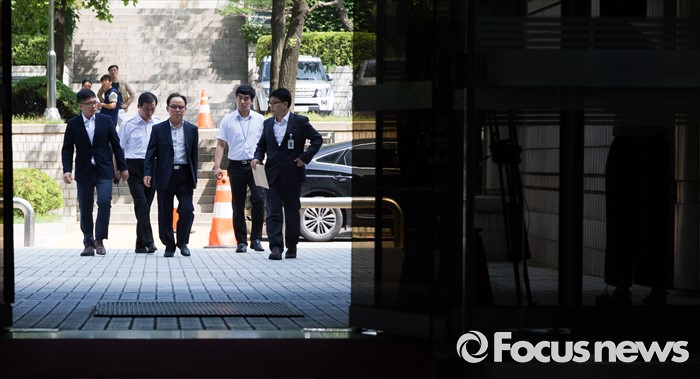 (서울=포커스뉴스) 롯데케미칼의 270억원대 조세포탈 혐의를 받고 있는 기준(가운데) 전 롯데물산 사장이 영장실질심사를 받기 위해 10일 오전 서울중앙지법으로 들어서고 있다.