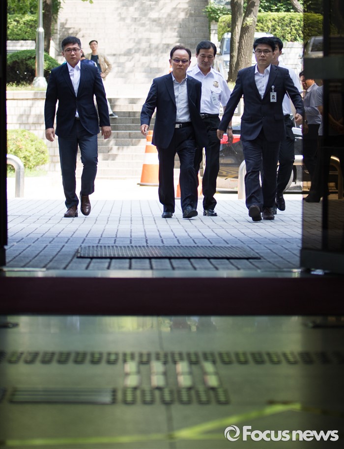 (서울=포커스뉴스) 롯데케미칼의 270억원대 조세포탈 혐의를 받고 있는 기준(가운데) 전 롯데물산 사장이 영장실질심사를 받기 위해 10일 오전 서울중앙지법으로 들어서고 있다.