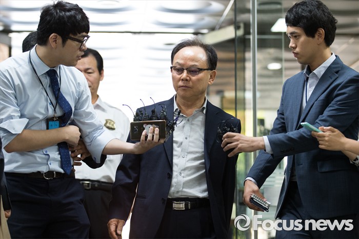 (서울=포커스뉴스) 롯데케미칼의 270억원대 조세포탈 혐의를 받고 있는 기준(가운데) 전 롯데물산 사장이 영장실질심사를 받기 위해 10일 오전 서울중앙지법으로 들어서고 있다.