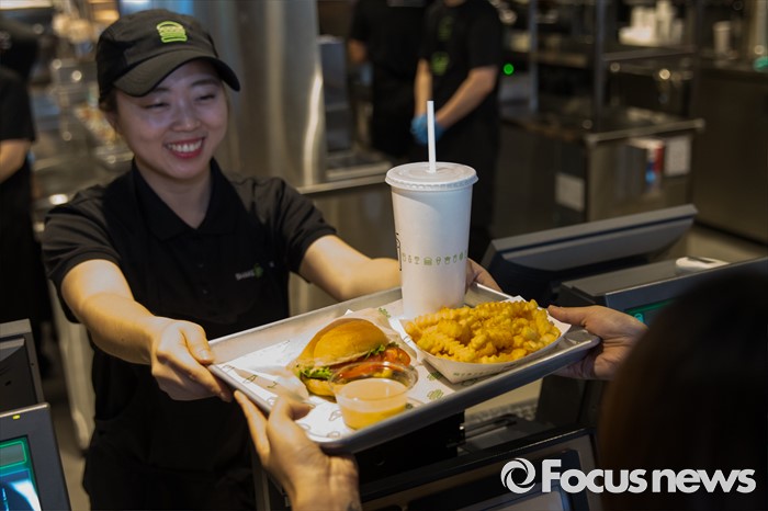 (서울=포커스뉴스) 22일 오전 서울 강남구 쉐이크쉑 국내 1호점 매장에서 매장 직원이 제품을 선보이고 있다. 기본 버거인 쉑버거 단품이 6900원, 슈룸버거 단품 9400원, 감자튀김 3900원, 쉐이크 음료가 5900원이다.