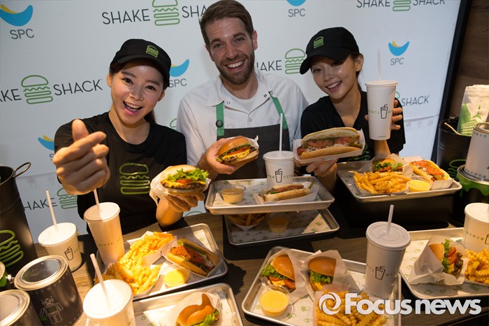 (서울=포커스뉴스) 22일 오전 서울 강남구 쉐이크쉑 국내 1호점 매장에서 쉐이크쉑 푸드 디렉터 마크 로사티(가운데)와 모델들이 제품을 선보이고 있다. 기본 버거인 쉑버거 단품이 6900원, 슈룸버거 단품 9400원, 감자튀김 3900원, 쉐이크 음료가 5900원이다.