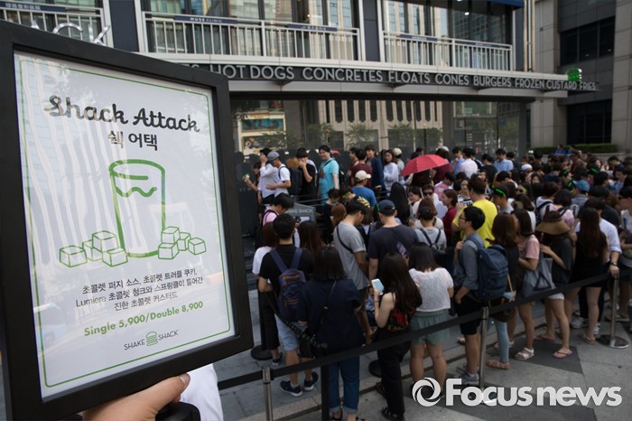 (서울=포커스뉴스) 22일 오전 서울 강남구 쉐이크쉑 국내 1호점 매장 앞에 시민들이 오픈을 앞두고 줄을 서고 있다.
