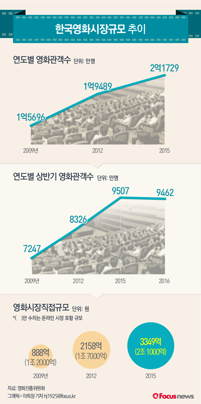 (서울=포커스뉴스) 영화진흥위원회에 따르면 한국영화시장의 규모가 점차 확대되고있다. 2016년 상반기 전체 극장 관객 수는 9,462만명으로 전년대비 소폭 하락했다.