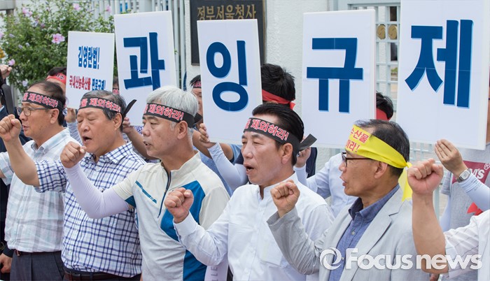 (서울=포커스뉴스) 22일 오후 서울정부청사 앞에서 열린 과잉규제 철폐촉구 농수축산인 기자회견에 참석한 한국농축산연합회 회원들이 김영란법을 반대하는 구호를 외치고 있다.