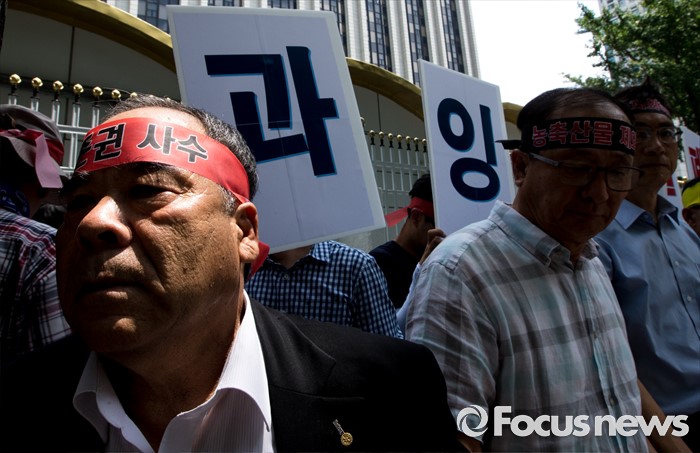 (서울=포커스뉴스) 22일 오후 서울정부청사 후문에서 한국농축산연합회 회원들이 김영란법 반대 집회를 갖고 있다.