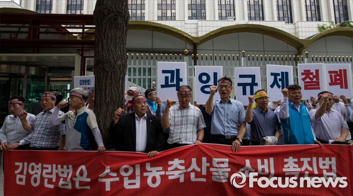 (서울=포커스뉴스) 22일 오후 서울정부청사 후문에서 한국농축산연합회 회원들이 김영란법 반대 집회를 갖고 있다.
