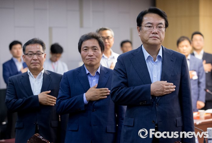 (서울=포커스뉴스) 22일 오후 서울 여의도 국회 의원회관에서 열린 '격차해소를 위한 해법, 왜 중향평준화인가?' 세미나에 참석한 정진석(오른쪽부터) 새누리당 원내대표, 이학재 정책위 일자리특위 위원장, 김태기 단국대 교수 등이 국기에 대한 경례를 하고 있다.