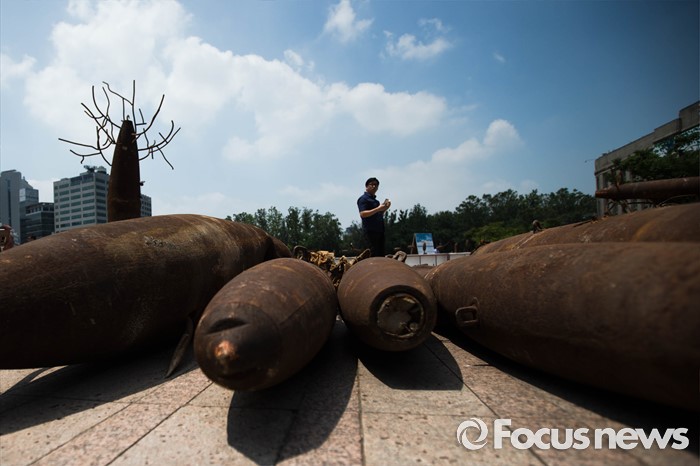 (서울=포커스뉴스) 22일 오후 서울 중구 서울광장에서 '전쟁 없는 세상을 위한 에이이브이(Art's Eye View) 프로젝트 전시가 열리고 있다. 미공군의 사격장으로 쓰였던 경기도 매향리에서 반출된 포탄 및 탄피를 활용, 1000여점의 예술작품으로 만든 이번 전시는 오는 24일까지 열릴 예정이다.