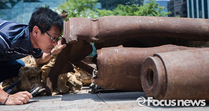 | △ 찢어진 포탄 들여다 보는 시민 |