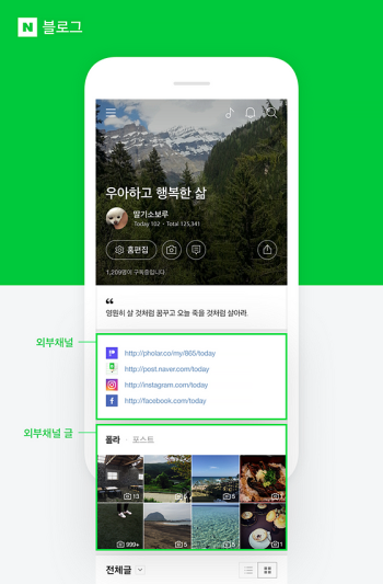 네이버는 22일 서비스 개편을 통해 블로거들이 운영 중인 페이스북, 인스타그램, 트위터, 카카오톡 플러스친구, 네이버 스토어팜, 포스트, 폴라 등을 한번에 모아서 소개할 수 있는 공식 공간인 '외부채널 영역'을 첫 화면에 마련하고 해당 SNS로 '바로가기' 뿐 아니라 콘텐츠 '미리보기' 기능도 추가했다.