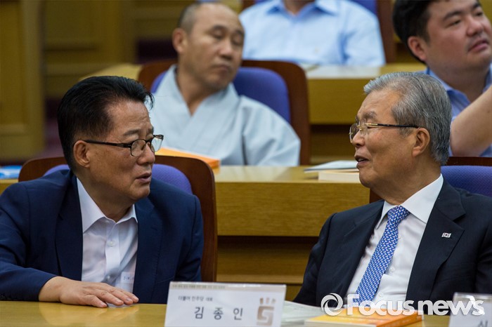 (서울=포커스뉴스) 김종인(오른쪽) 더불어민주당 비상대책위 대표와 박지원 국민의당 비상대책위원장이 22일 오후 서울 여의도 국회의원회관에서 열린 '5.18 왜곡 방지와 관련 법안 개정(처별규정) 위한 국민 토론회'에 참석해 대화 하고 있다.