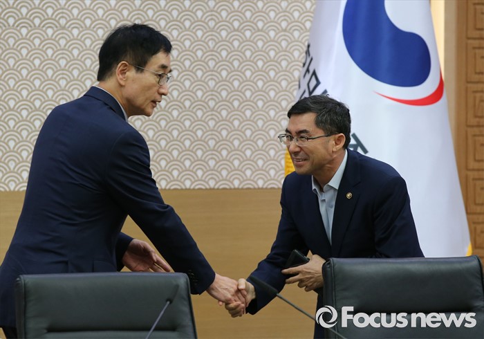(세종=포커스뉴스) 22일 오후 세종시 정부세종청사 국무회의장에서 열린 임시국무회의에서 이준식(왼쪽) 부총리 겸 교육부장관이 이준원 농림축산식품부 차관과 악수하고 있다.