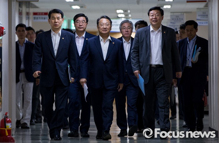 (서울=포커스뉴스) 22일 오후 서울정부청사에서 열린 2016년 추경예산안 합동브리핑에 유일호 경제부총리 겸 기획재정부 장관을 비롯한 장관들이 참석하고 있다. 앞줄 왼쪽부터정은보 금융위원회 부위원장, 이기권 고용노동부 장관, 부총리, 김종덕 문화체육관광부 장관, 주형환 산업통상자원부 장관.