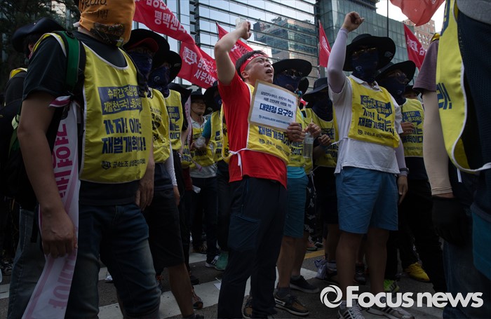 (서울=포커스뉴스) 금속노조 삼성전자서비스지회 조합원들이 22일 오후 서울 서초구 삼성 서초사옥 앞에서 열린 '재벌개혁 투쟁 결의대회'에 참석해 수리기사 추락사에 따른 안전대책 마련을 위한 대원청 요구안을 전달하기 위해 이동하며 구호를 외치고 있다.
