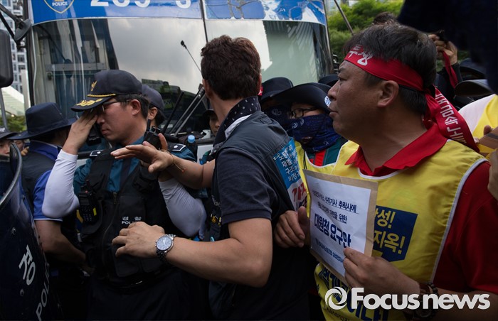 (서울=포커스뉴스) 금속노조 삼성전자서비스지회 조합원들이 22일 오후 서울 서초구 삼성 서초사옥 앞에서 열린 '재벌개혁 투쟁 결의대회'에 참석해 수리기사 추락사에 따른 안전대책 마련을 위한 대원청 요구안을 전달하기 위해 이동하던 중 경찰과 대치하고 있다.