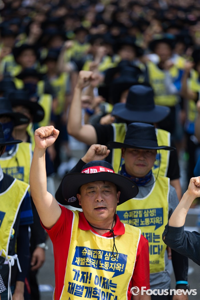 (서울=포커스뉴스) 금속노조 삼성전자서비스지회 조합원들이 22일 오후 서울 서초구 삼성 서초사옥 앞에서 열린 '재벌개혁 투쟁 결의대회'에 참석해 삼성가 3대 세습을 비판하는 구호를 외치고 있다.