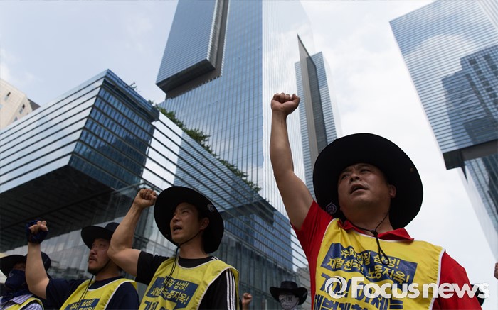 (서울=포커스뉴스) 금속노조 삼성전자서비스지회 조합원들이 22일 오후 서울 서초구 삼성 서초사옥 앞에서 열린 '재벌개혁 투쟁 결의대회'에 참석해 삼성가 3대 세습을 비판하는 구호를 외치고 있다.
