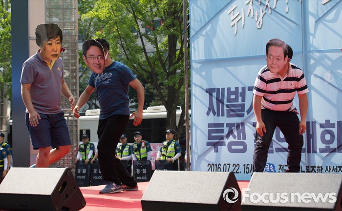 (서울=포커스뉴스) 금속노조 삼성전자서비스지회 조합원들이 22일 오후 서울 서초구 삼성 서초사옥 앞에서 열린 '재벌개혁 투쟁 결의대회'에 참석해 이재용 3대 세습을 비판하는 퍼포먼스를 펼치고 있다.