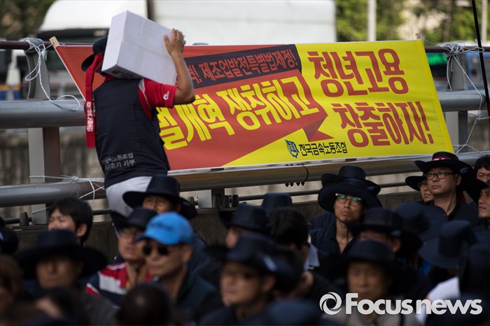 (서울=포커스뉴스) 정부의 일방적인 조선업 구조조정 중단과 현대차 그룹의 성실한 그룹사 공동교섭 참여, 정부의 노동개악 철회등을 내걸며 파업에 들어간 전국금속노조가 22일 오후 서울 서초구 현대자동차 본사 앞에서 금속노조 총파업 대회를 열고 있다.