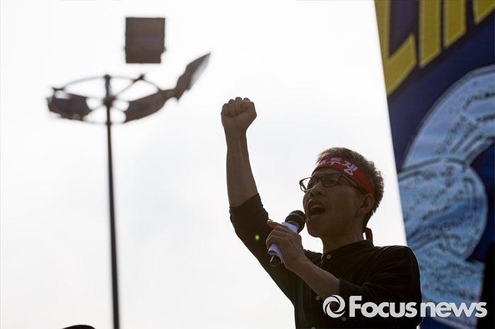 (서울=포커스뉴스) 정부의 일방적인 조선업 구조조정 중단과 현대차 그룹의 성실한 그룹사 공동교섭 참여, 정부의 노동개악 철회등을 내걸며 파업에 들어간 전국금속노조가 22일 오후 서울 서초구 현대자동차 본사 앞에서 금속노조 총파업 대회를 열고 있다.