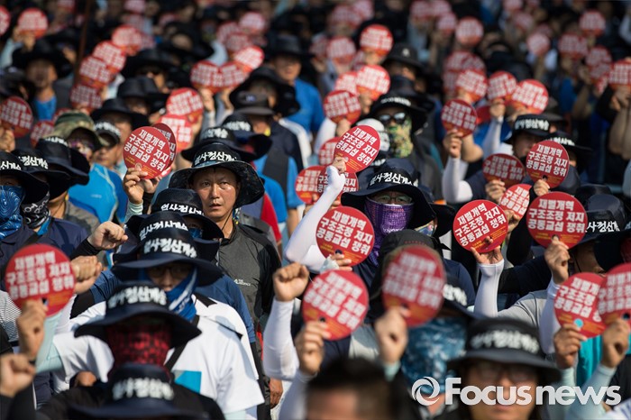 (서울=포커스뉴스) 정부의 일방적인 조선업 구조조정 중단과 현대차 그룹의 성실한 그룹사 공동교섭 참여, 정부의 노동개악 철회등을 내걸며 파업에 들어간 전국금속노조가 22일 오후 서울 서초구 현대자동차 본사 앞에서 금속노조 총파업 대회를 열고 있다.