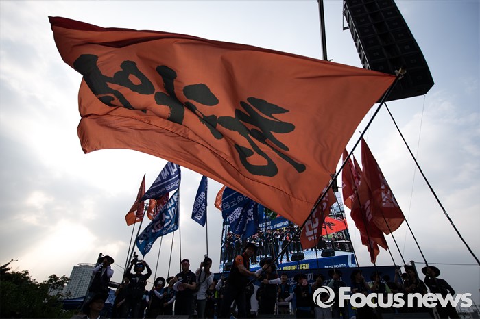 (서울=포커스뉴스) 정부의 일방적인 조선업 구조조정 중단과 현대차 그룹의 성실한 그룹사 공동교섭 참여, 정부의 노동개악 철회등을 내걸며 파업에 들어간 전국금속노조가 22일 오후 서울 서초구 현대자동차 본사 앞에서 금속노조 총파업 대회를 열고 있다.