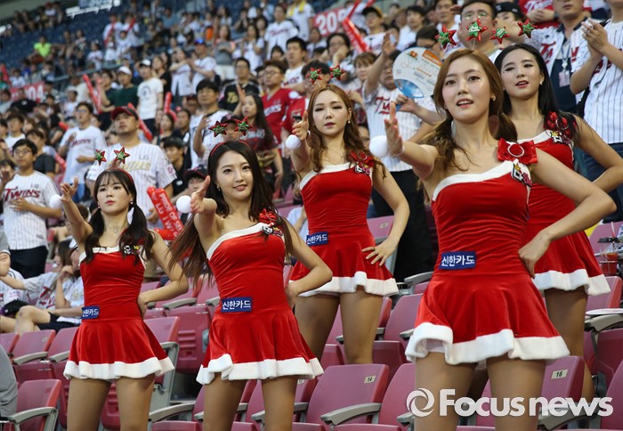 (서울=포커스뉴스) 22일 서울 잠실구장에서 열린 2016 프로야구 두산-LG 경기에서 LG 치어리더가 '섬머 크리스마스' 주제에 맞춰 산타 복장을 하고 관중석에서 열렬한 응원으로 한 여름의 더위를 식혀주고 있다.