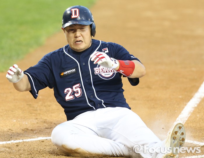 (서울=포커스뉴스) 22일 서울 잠실구장에서 열린 2016 프로야구 두산-LG 경기 4회초 1사 1루에서 두산 1루주자 양의지가 에반스의 좌중간 2루타때 홈에서 슬라이딩하며 세이프되고 있다.