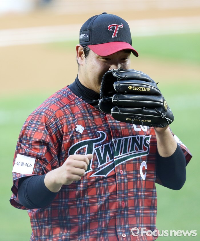 (서울=포커스뉴스) 22일 서울 잠실구장에서 열린 2016 프로야구 두산-LG 경기에서 LG 투수 류제국이 3회초 무사 1,2루의 실점 위기를 무사히 넘기고 더그아웃으로 들어가고 있다.
