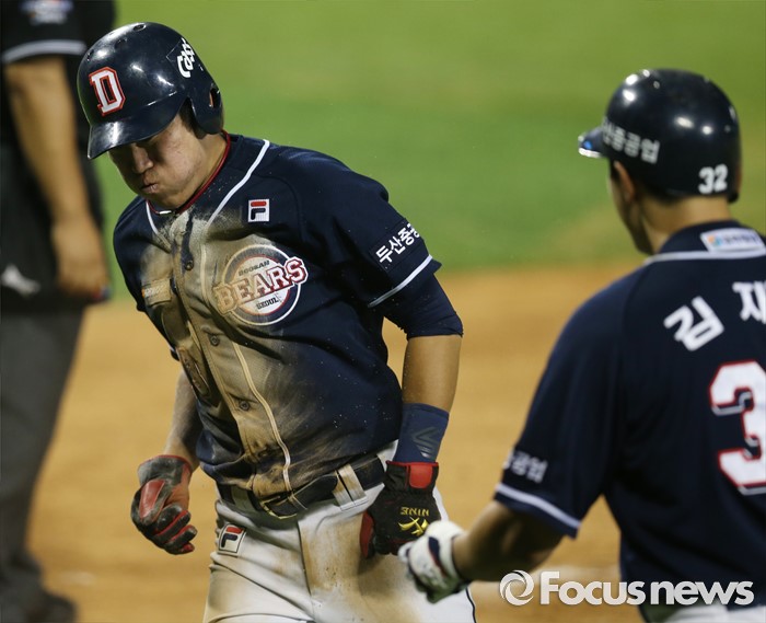(서울=포커스뉴스) 22일 서울 잠실구장에서 열린 2016 프로야구 두산-LG 경기 6회초 1사 1,3루에서 두산 박건우의 2루수 희생플라이 아웃때 3루주자 허경민이 홈으로 뛰어들어 득점에 성공하고 있다.