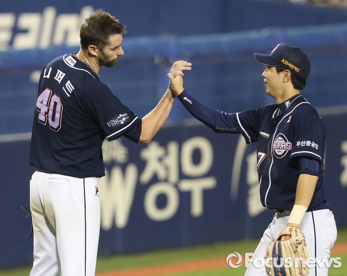(서울=포커스뉴스) 22일 서울 잠실구장에서 열린 2016 프로야구 두산-LG 경기에서 두산 선발 니퍼트가 6회말에 실점한 것은 자기 탓이라고 동료 야수들과 일일이 하이파이브하고 있다. 우익수 박건우와 손을 마주치고 있다.