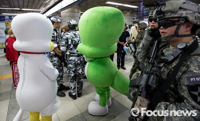 (서울=포커스뉴스) 23일 오전 서울 도봉구 쌍문역에서 코스프레를 한 학생들이 둘리뮤지엄 개관 1주년 기념행사 '둘리네 집들이' 퍼레이드를 기다리고 있다.