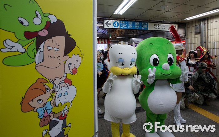 (서울=포커스뉴스) 23일 오전 서울 도봉구 쌍문역에서 둘리, 또치가 기념촬영을 하고 있다, 이날 쌍문동 둘리뮤지엄에서는 개관 1주년을 맞아'둘리네 집들이' 가 열렸다.
