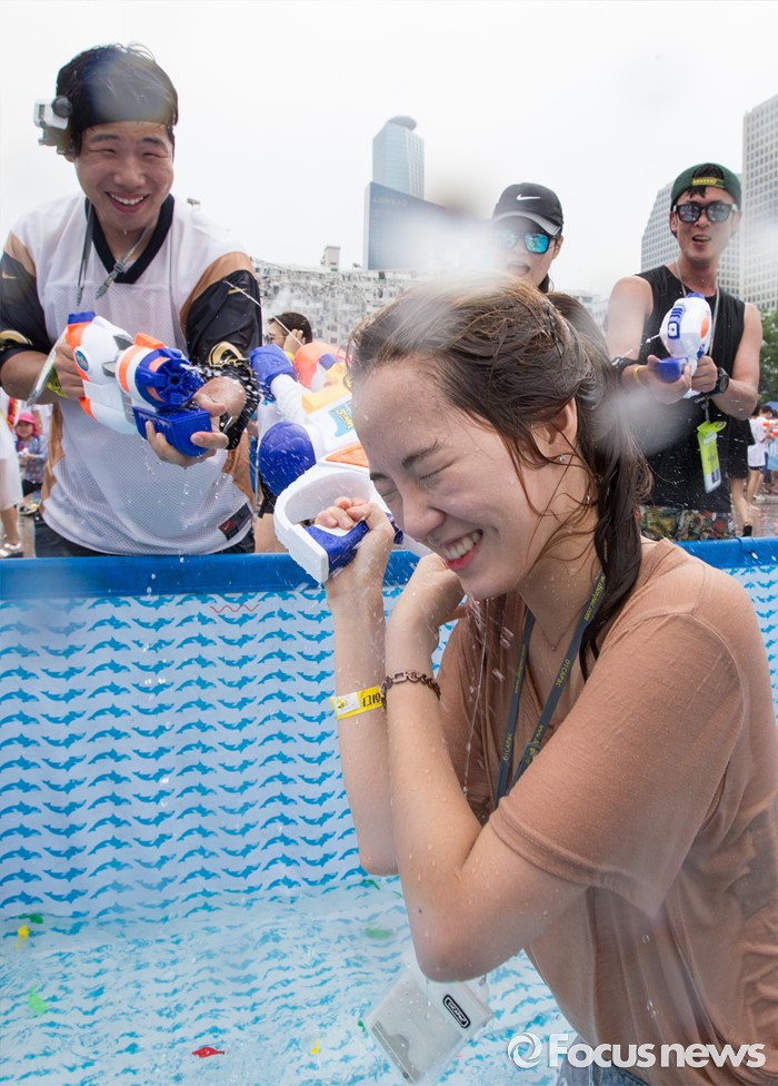 (서울=포커스뉴스) 23일 오후 서울 여의도 한강공원에서 열린 한강 물싸움 축제에서 참가자들이 시원한 물총싸움을 하며 더위를 식히고 있다.
