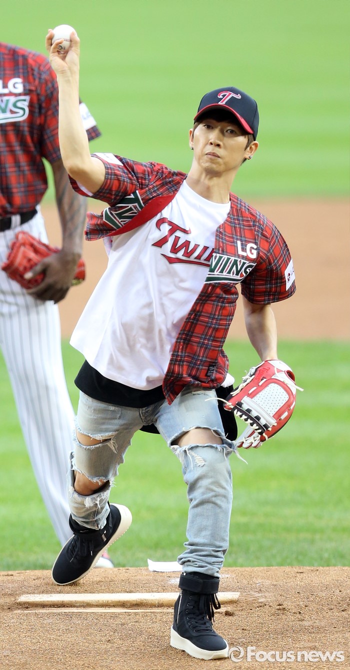 (서울=포커스뉴스) 24일 서울 잠실구장에서 열린 2016 프로야구 두산-LG 경기에 앞서 가수 장우혁이 시구하고 있다.