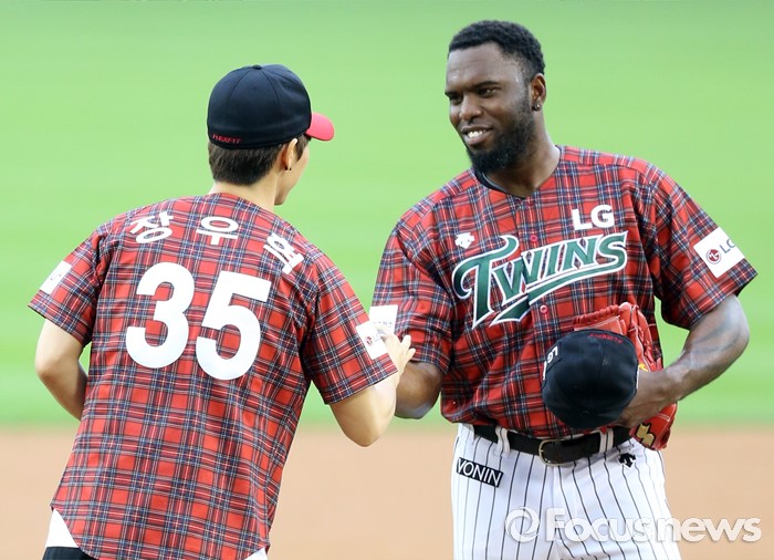 (서울=포커스뉴스) 24일 서울 잠실구장에서 열린 2016 프로야구 두산-LG 경기에 앞서 시구자롤 나온 가수 장우혁이 LG 선발투수 소사와 악수하고 있다.