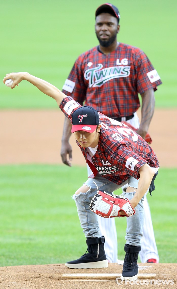 (서울=포커스뉴스) 24일 서울 잠실구장에서 열린 2016 프로야구 두산-LG 경기에 앞서 시구자롤 나온 가수 장우혁이 포수를 보며 세리머니를 하고 있다.
