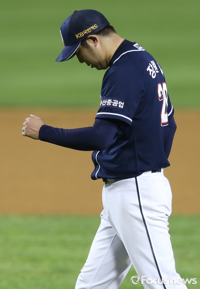 (서울=포커스뉴스) 24일 서울 잠실구장에서 열린 2016 프로야구 두산-LG 경기 7회말 2사 1,3루에서 두산 선발투수 장원준이 LG 오지환을 삼진 아웃시키며 실점 위기를 벗어나고 주먹을 불끈 쥐며 불펜으로 향하고 있다.