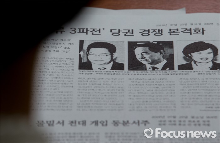 (서울=포커스뉴스) 25일 오전 서울 여의도 국회에서 열린 더불어민주당 비상대책위원회의에 참석한 한 의원이 전당대회 출마 의원들 관련 언론기사를 보고 있다.
