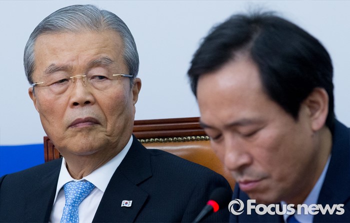 (서울=포커스뉴스) 김종인(왼쪽) 더불어민주당 비대위 대표가 25일 오전 서울 여의도 국회에서 열린 비상대책위원회의에 참석해 우상호 원내대표의 발언을 듣고 있다.