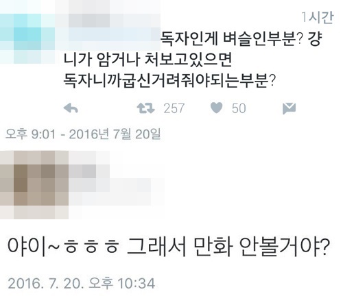 (서울=포커스뉴스) "독자인 게 벼슬? 니가 아무거나 쳐보고 있으면 독자니까 굽신거려줘야 해?", "그래서 만화 안 볼 거야? 재미있게 봐 놓고 유치하게 왜 이래."